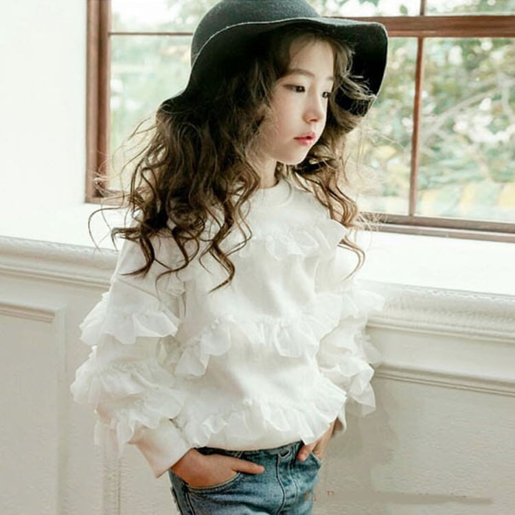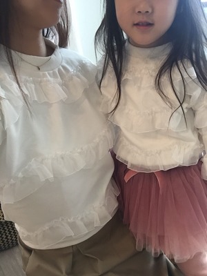 ♡110cm~大人サイズあり♡オーガンジーフリルプルオーバー/レース/袖コンシャス/オーバーサイズ/トレーナー/キッズ/レディース/親子リンク/リンクコーデ/ママ/子供服