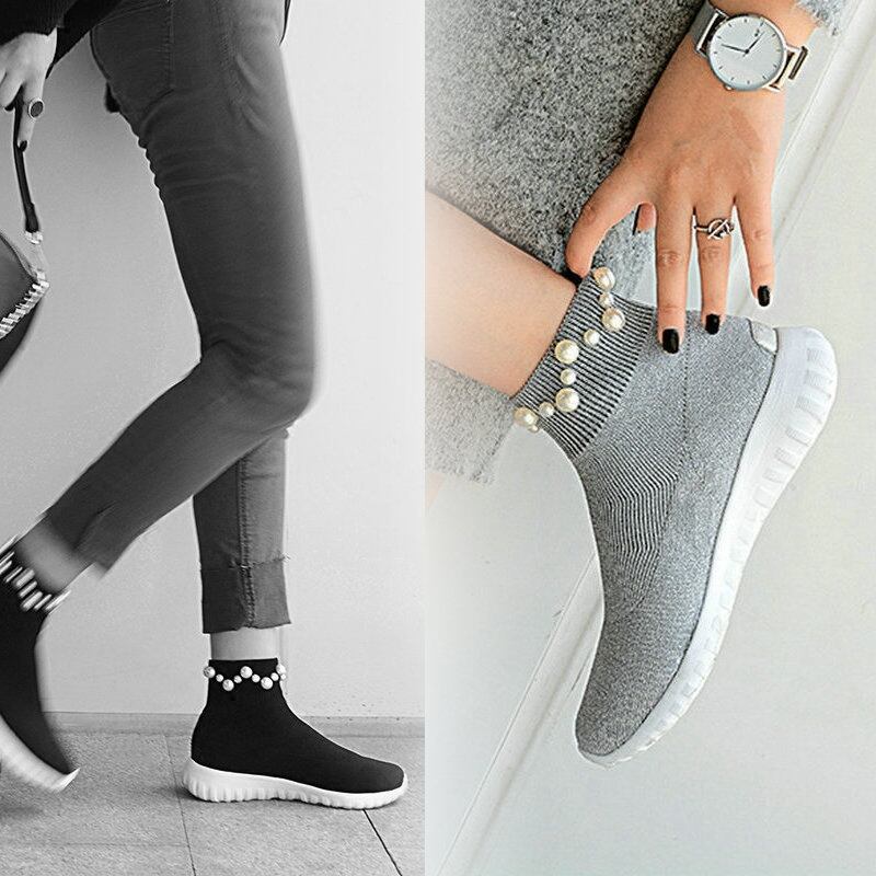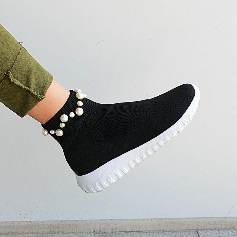 パール付きソックスハイトップスニーカー/ニット/スニーカー/シューズ/2018/韓国ファッション ドッキングスニーカー ソックス スニーカー ハイカット 厚底スニーカー ハイカットスニーカー 黒 シューズ カジュアル 靴