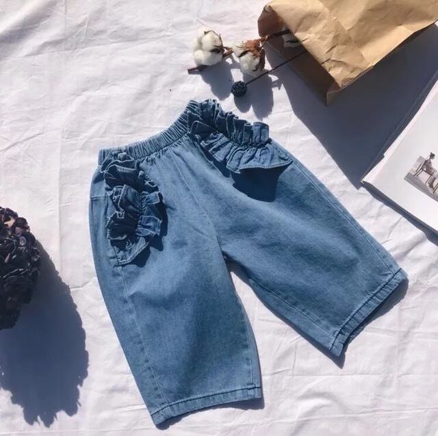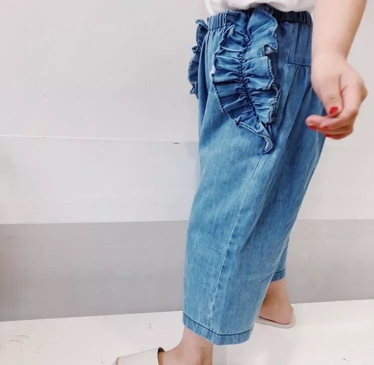 ★KIDS♡80〜130/ラッフル ポケット ワイド デニム パンツ/9分丈/フリル/ボトム/可愛い/ジーパン/ズボン/デニムパンツ/ワイドパンツ/子供服/女の子/2018