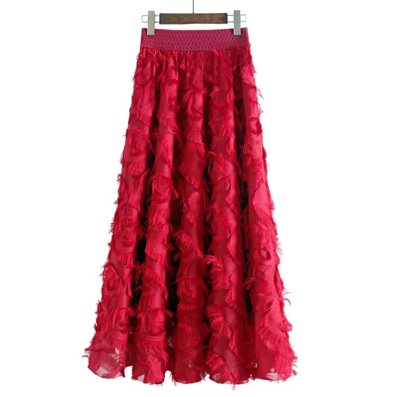 予約★フェザー マキシ丈 フレアスカート/ロングスカート/ふわふわ/シフォン/膝下/フリンジ/レディース ボトムス 2018